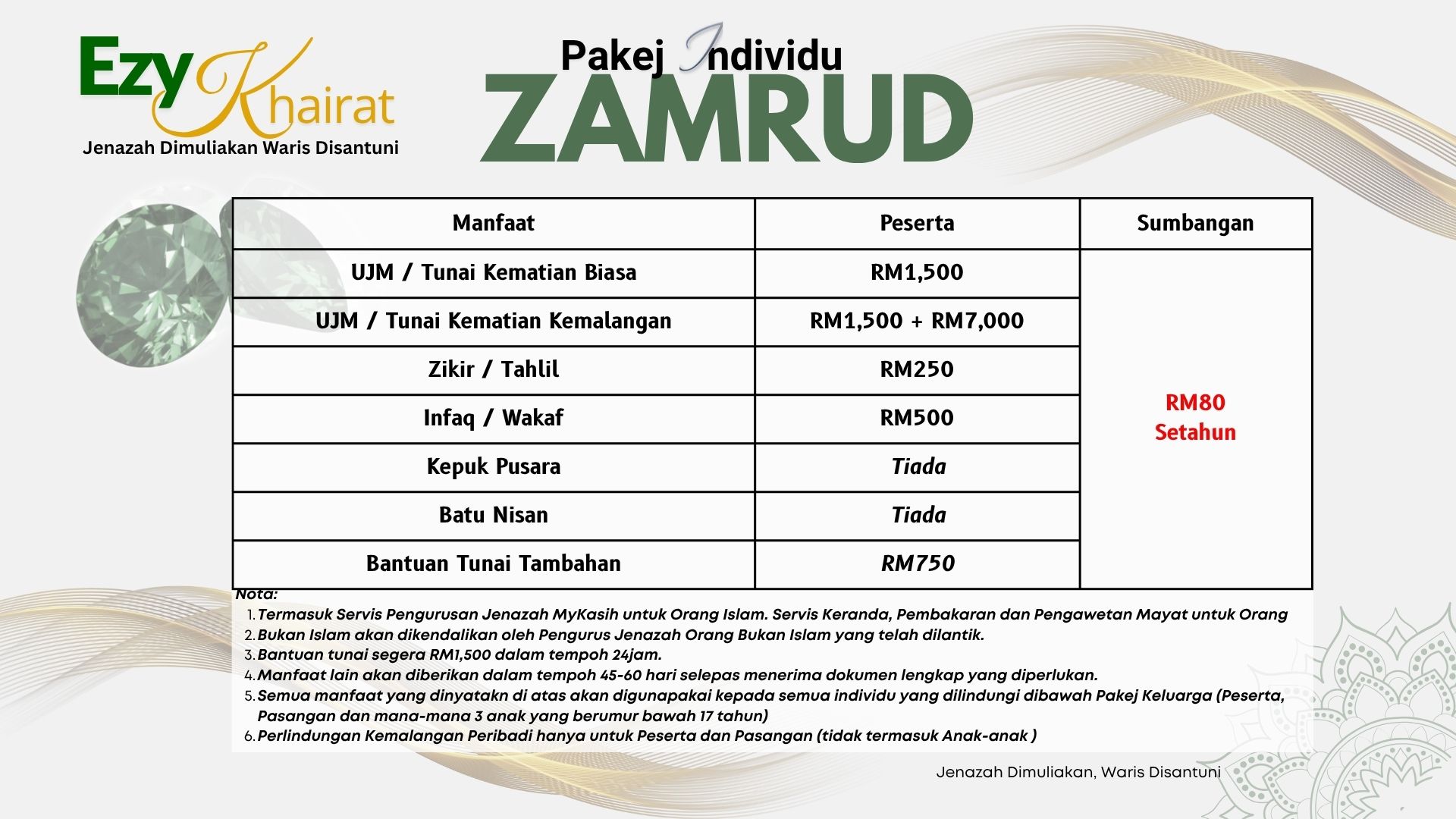 Oleh itu EzyKhairat diperkenalkan bagi menyediakan kemudahan pasukan pengurusan jenazah atau bantuan kewangan segera, kepada semua ahli / peserta khususnya dan umat Islam di Malaysia amnya.