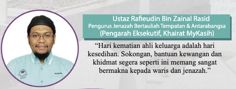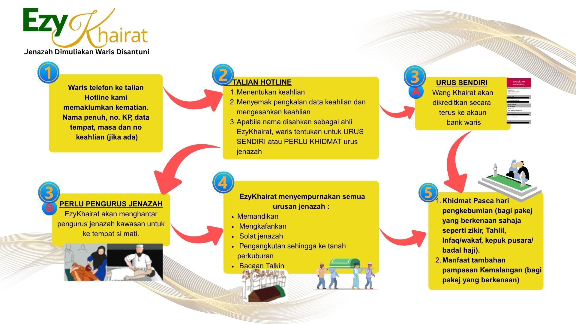 Apabila berlaku kematian, pihak waris boleh memilih untuk mendapat Pengurusan jenazah lengkap daripada pihak EzyKhairat atau memilih untuk bantuan kewangan tunai (khairat) segera di hari kematian.